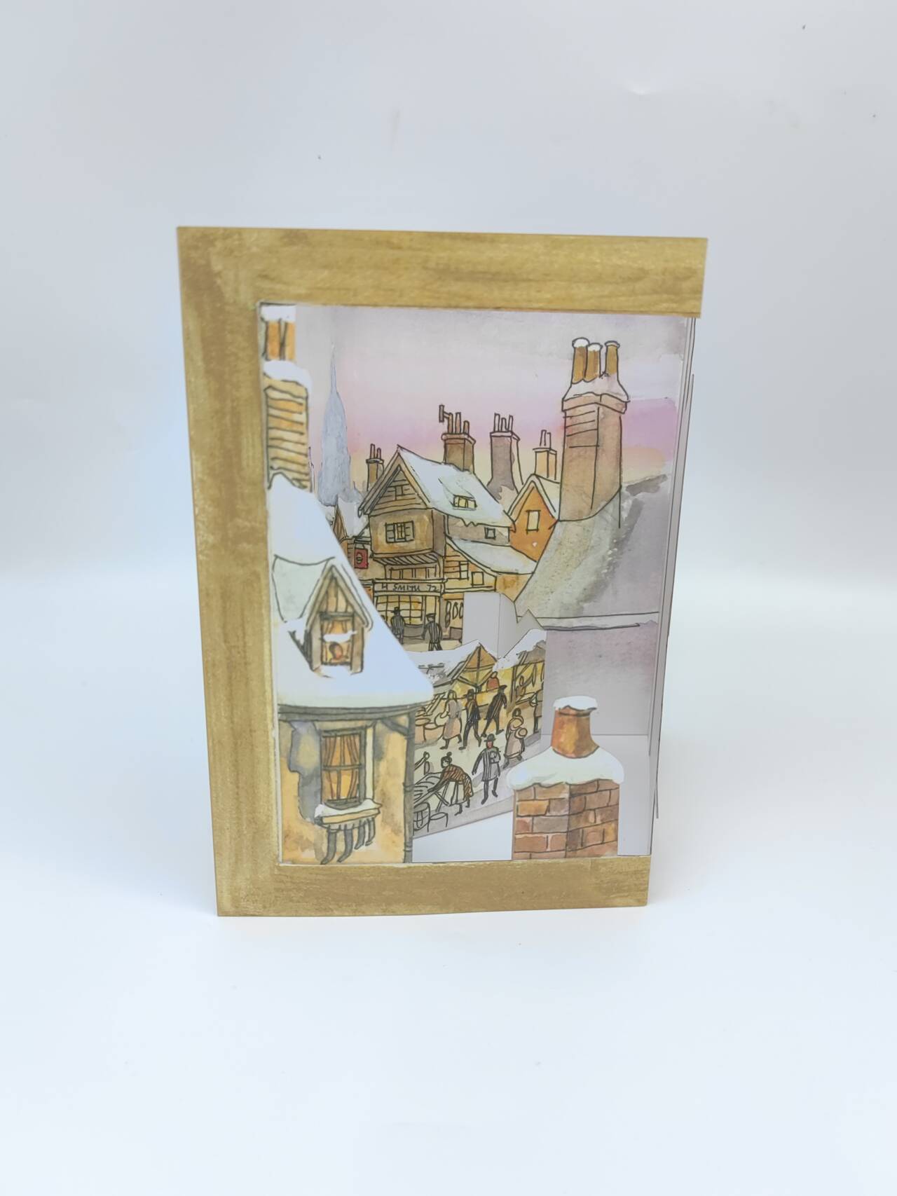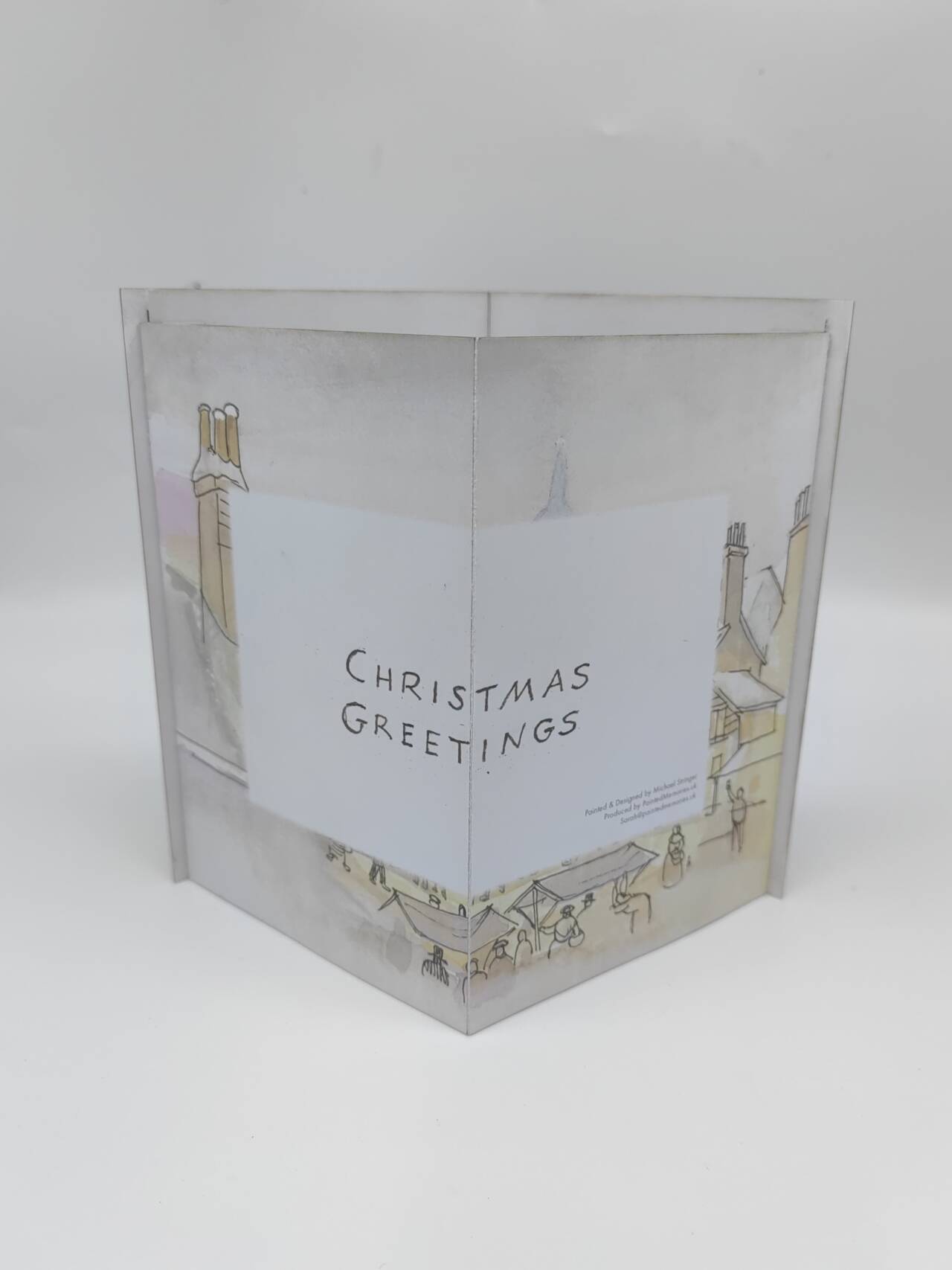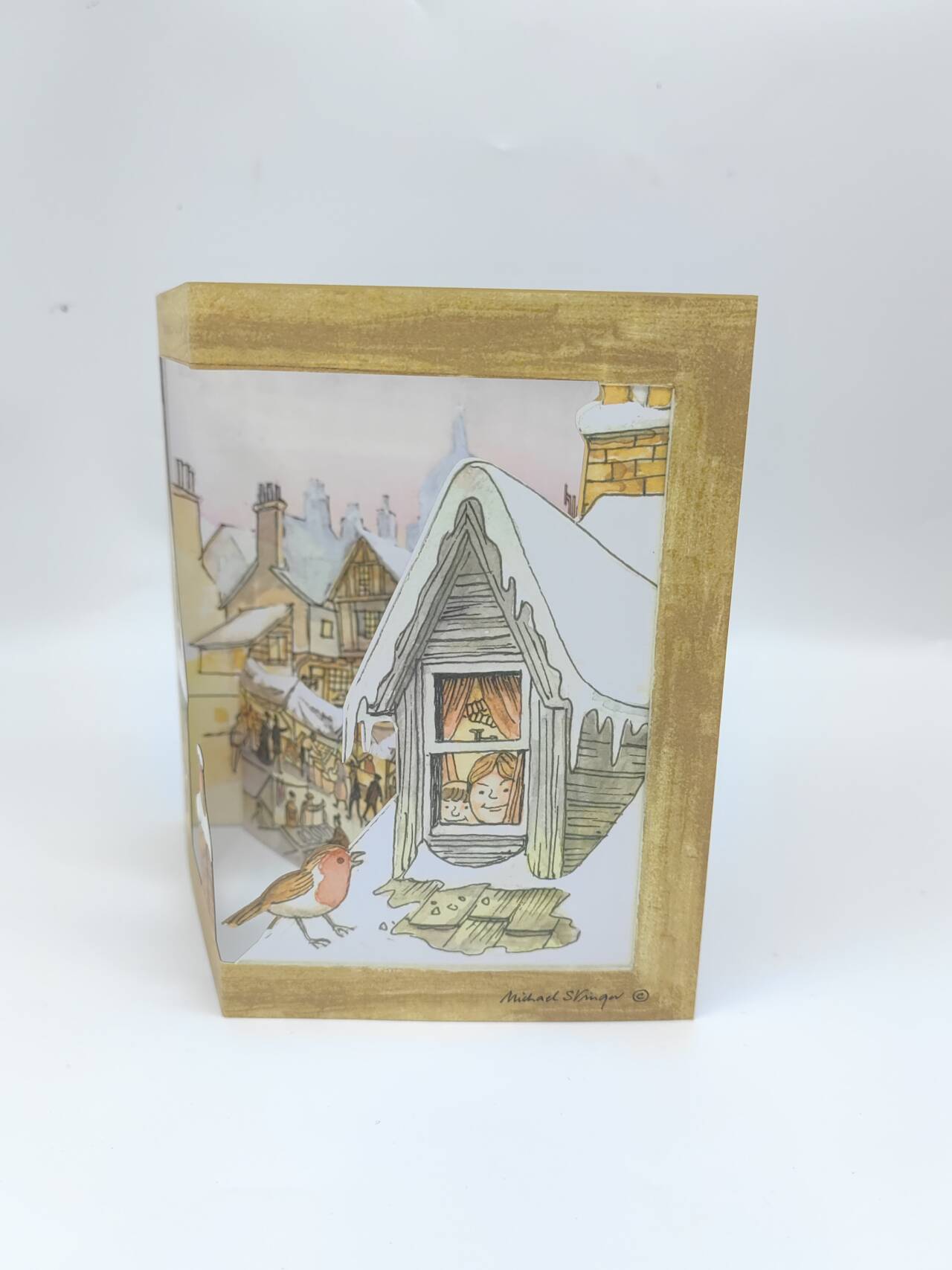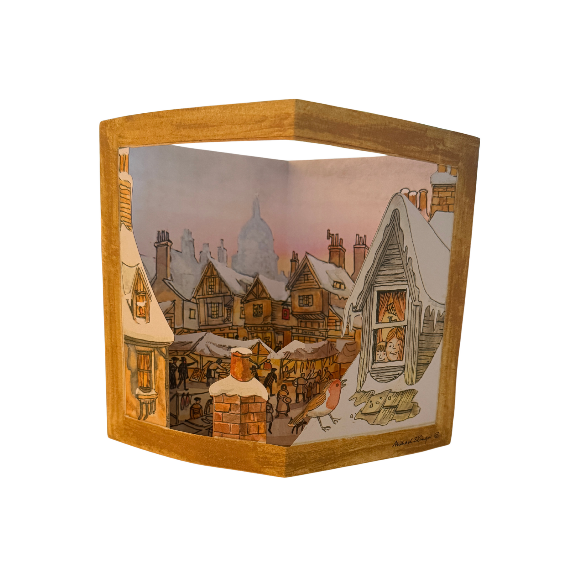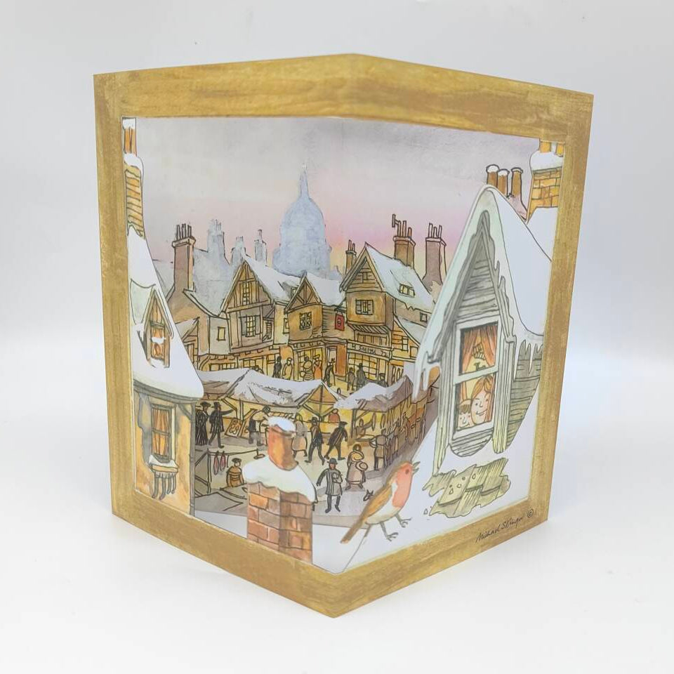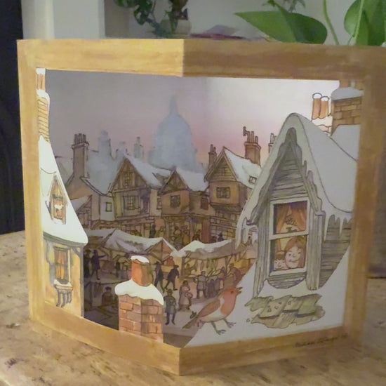 A bustling Christmas market unfolds under snowy rooftops, with stalls lit against the winter twilight. A robin perches cheerfully on a chimney while children press their faces to frosted windows. The scene captures the joy of community and festive bustle in a bygone era.