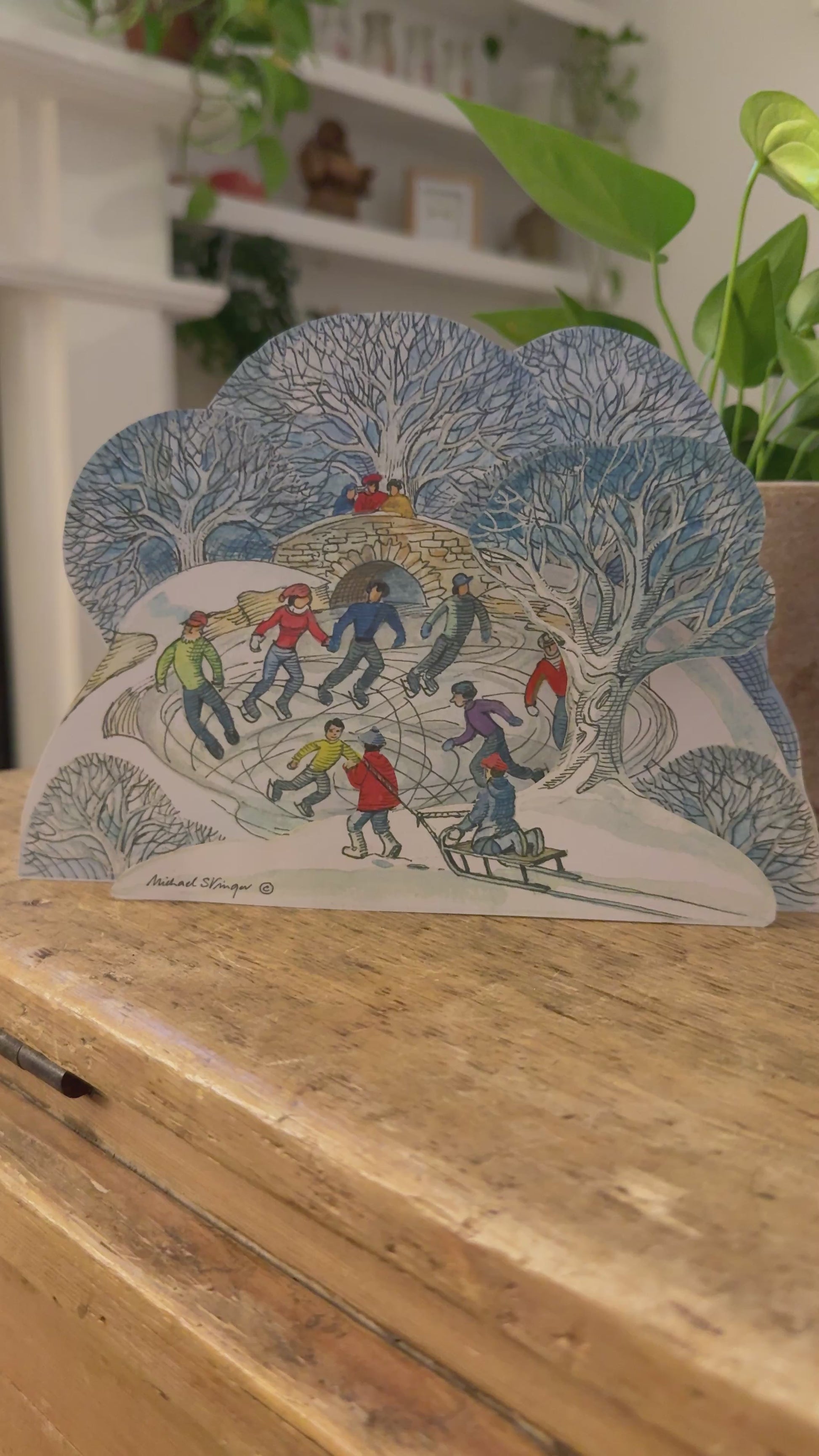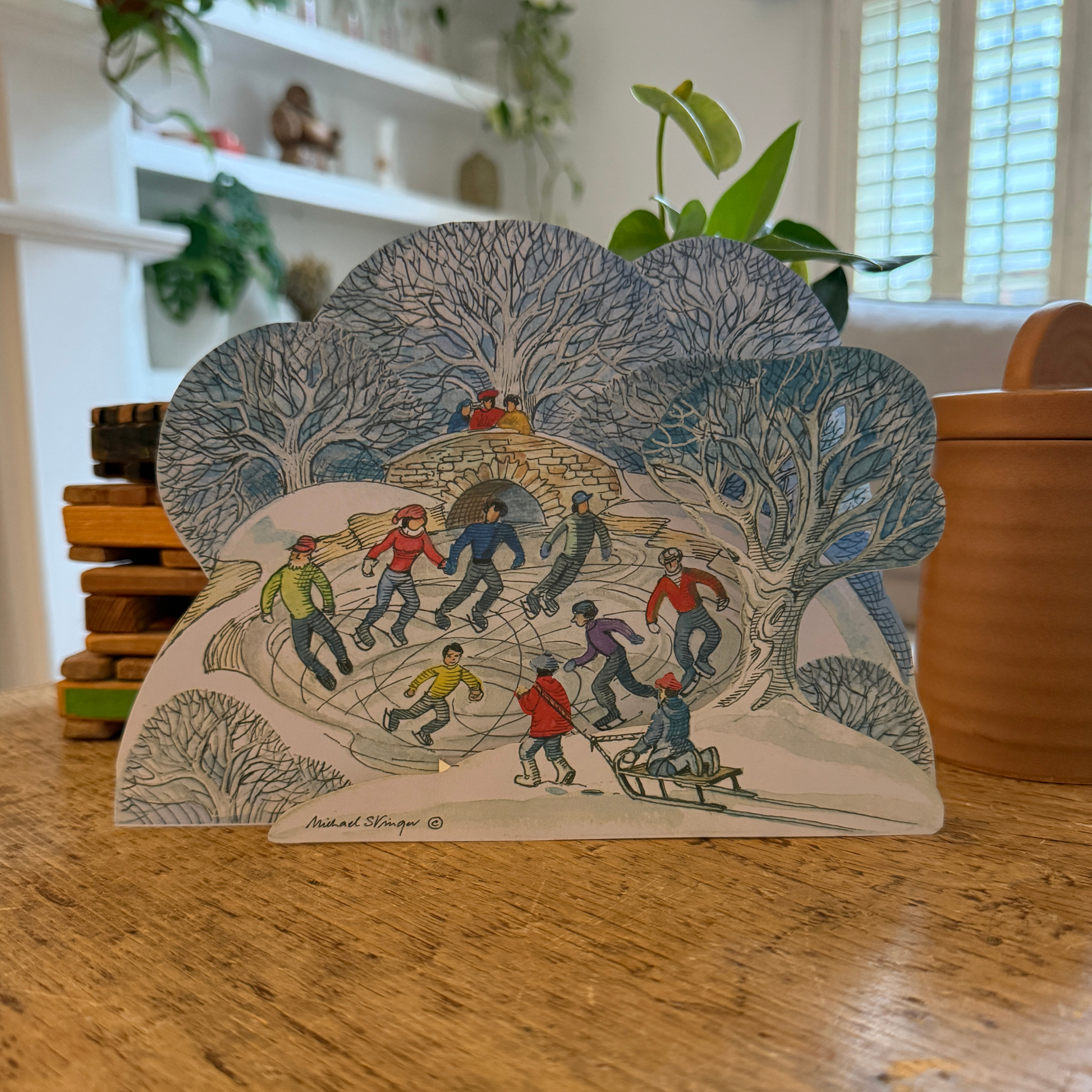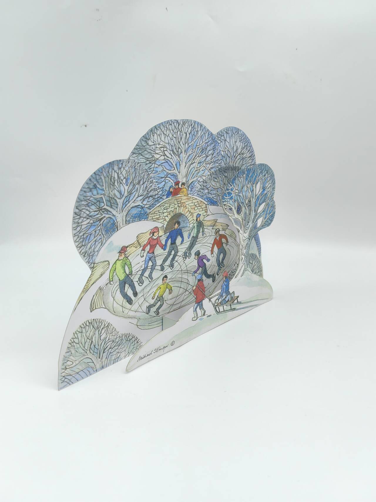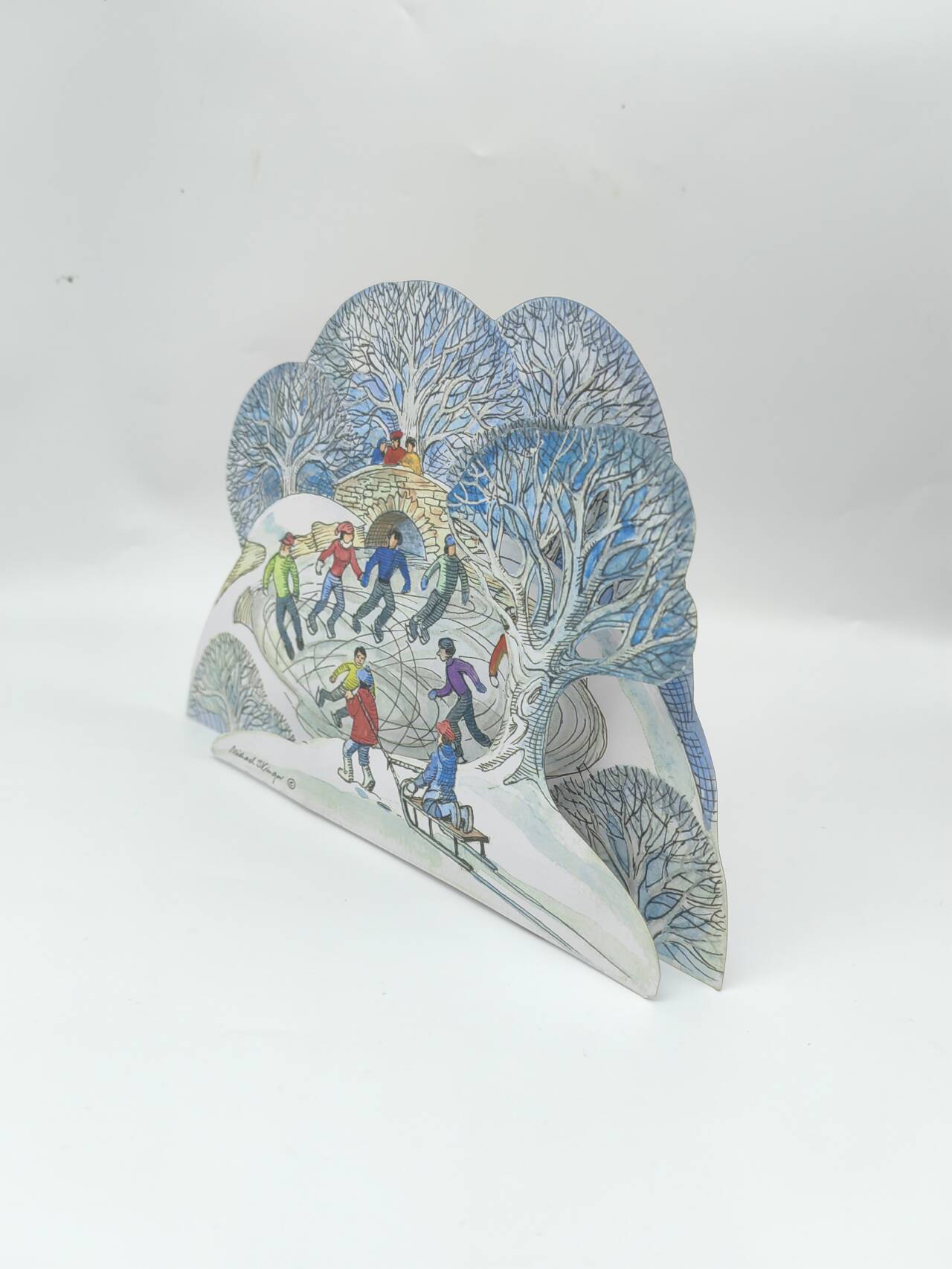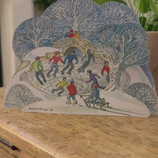Set against a frosty woodland, children and families skate joyfully on a frozen pond while others sledge and laugh together. The scene captures the simple, timeless pleasures of winter play, full of energy and movement.