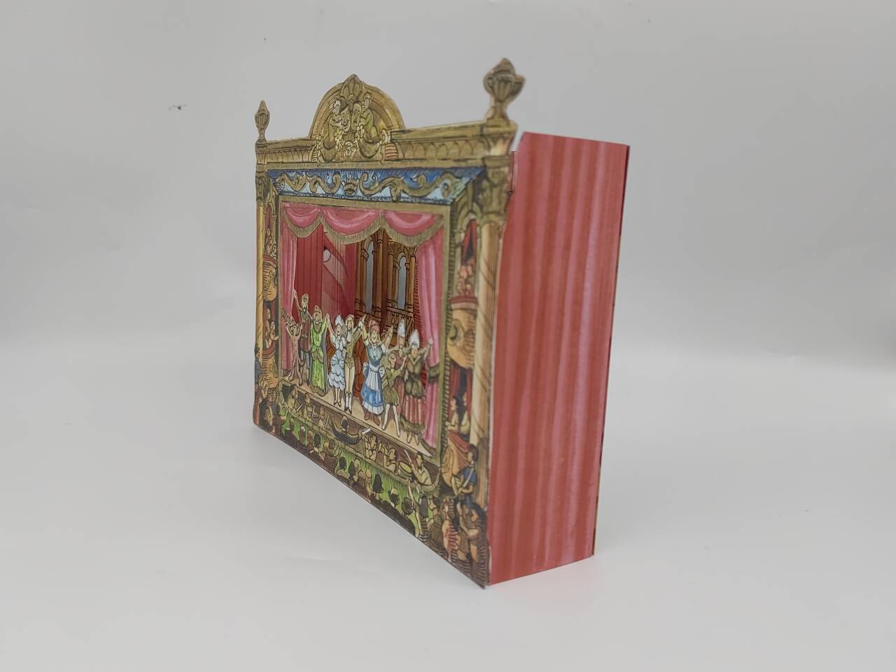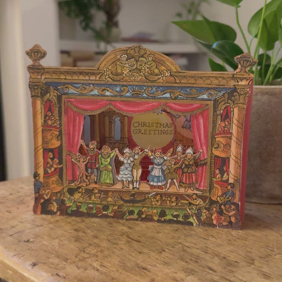 A vibrant theatre scene bursts with colour as a cast of pantomime performers take their bow before a cheering audience. Above the stage hangs a banner wishing “Christmas Greetings,” celebrating the magic of performance and tradition.