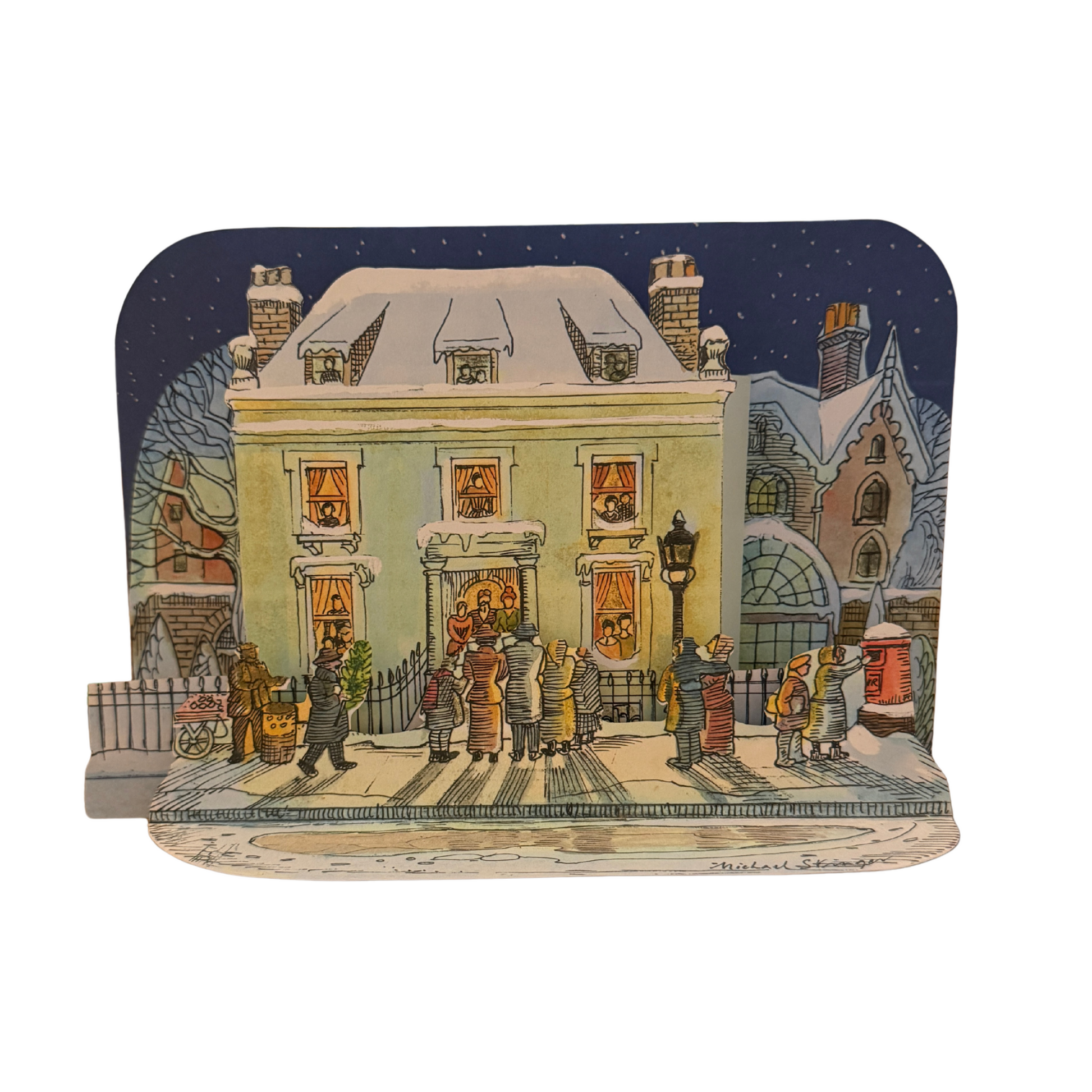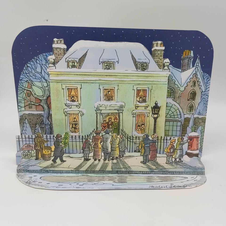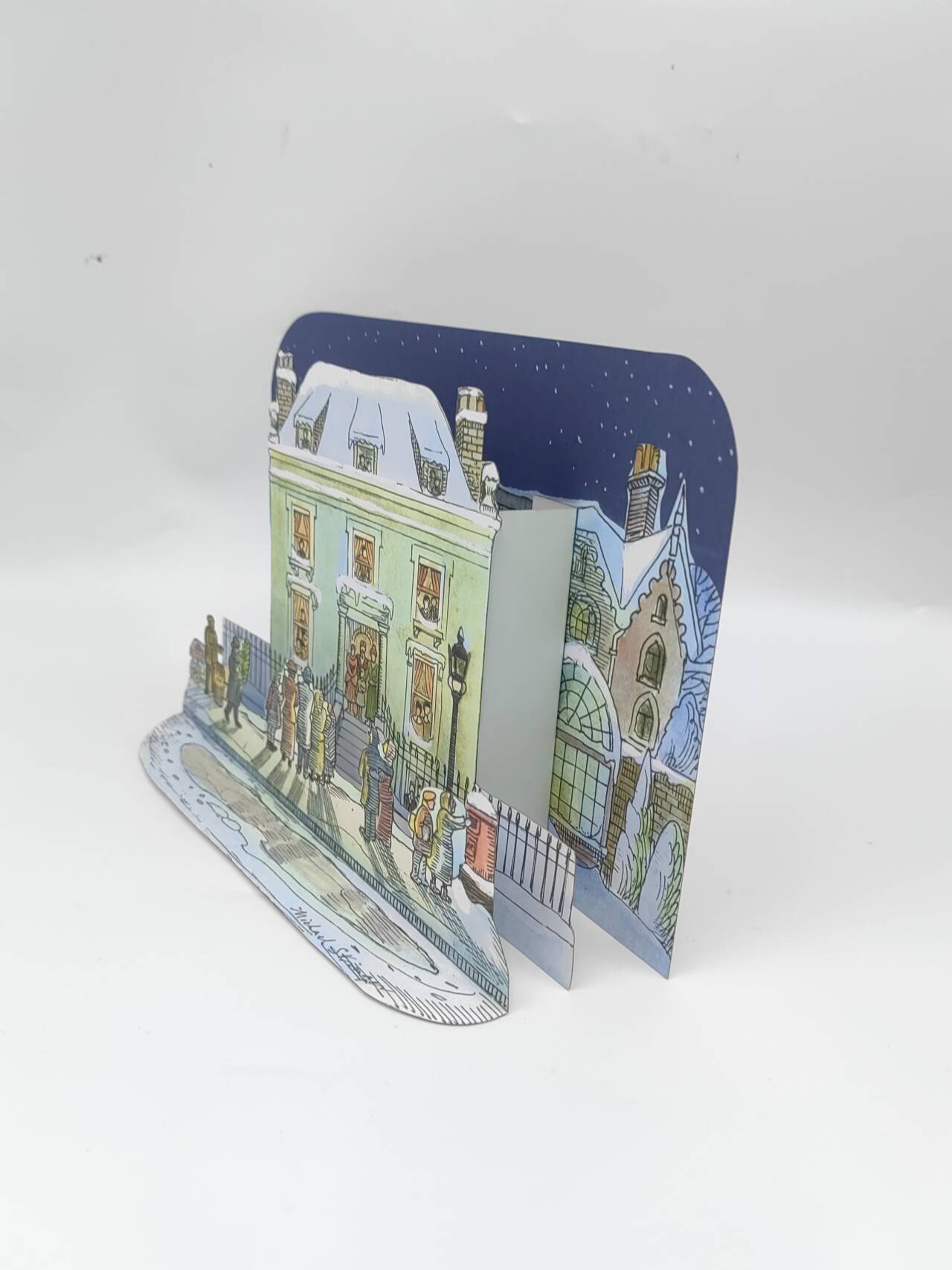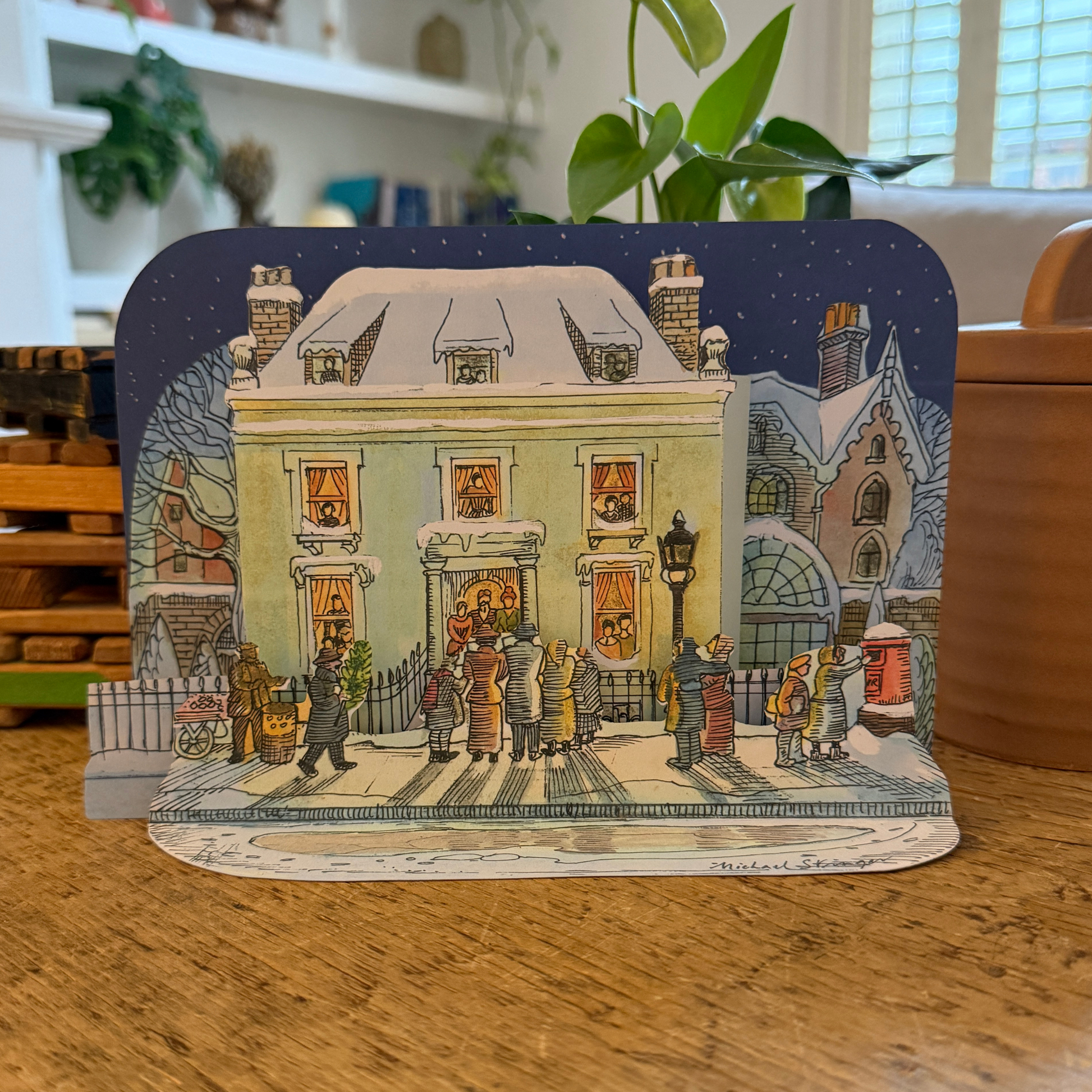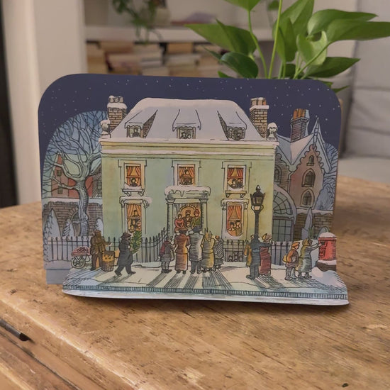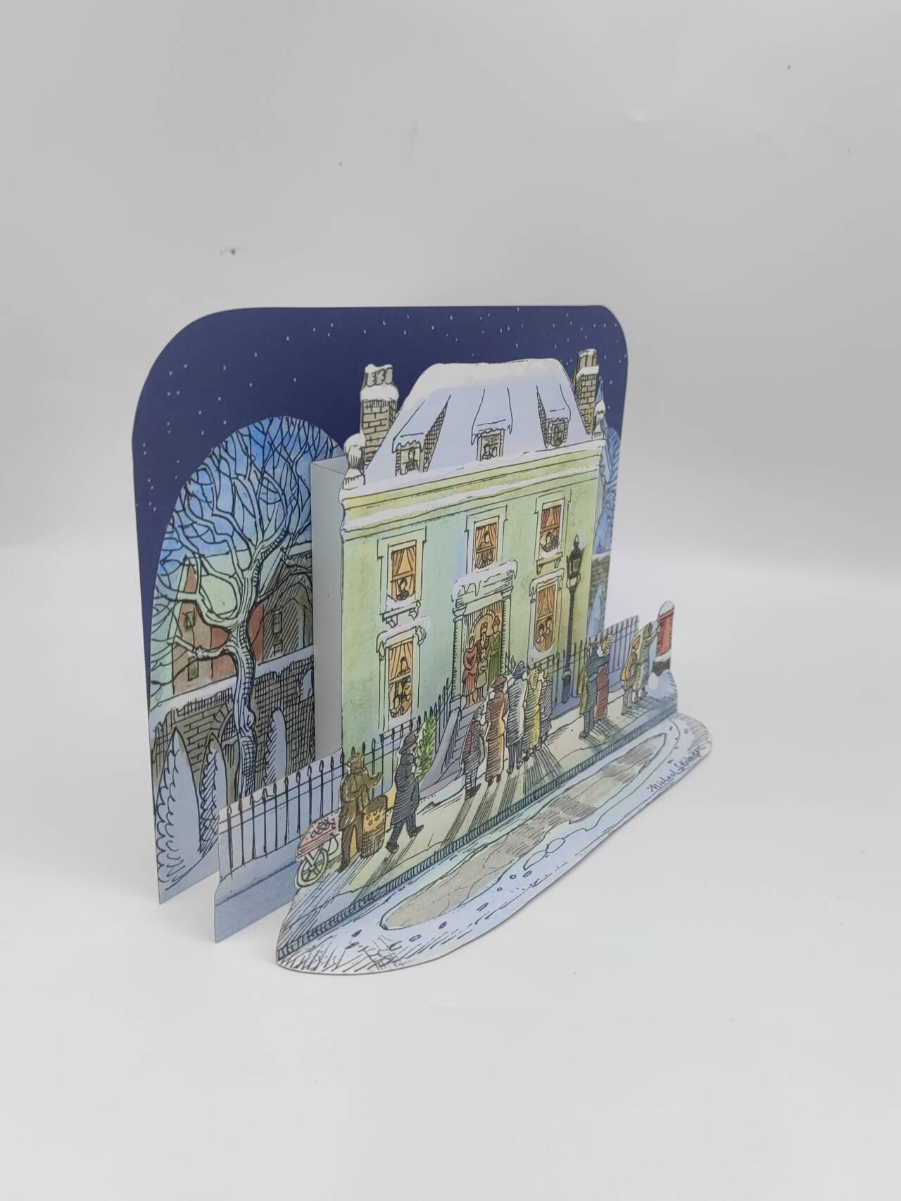 Outside a grand Georgian house, carol singers line up beneath twinkling windows while warmly dressed figures gather to listen. The starry night and snow-dusted rooftops create a timeless festive atmosphere of joy, music, and togetherness.
